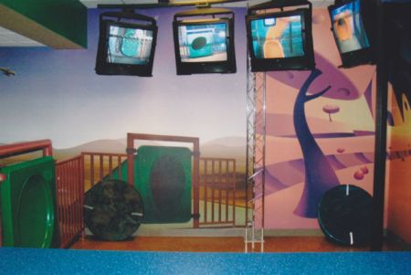They had slides that took you from the kids check in area, right into the class room. When kids landed in the room, they could look at the monitor and wave good-bye to their parents. The parents could wave back using cameras and monitors at both ends of the slides.
